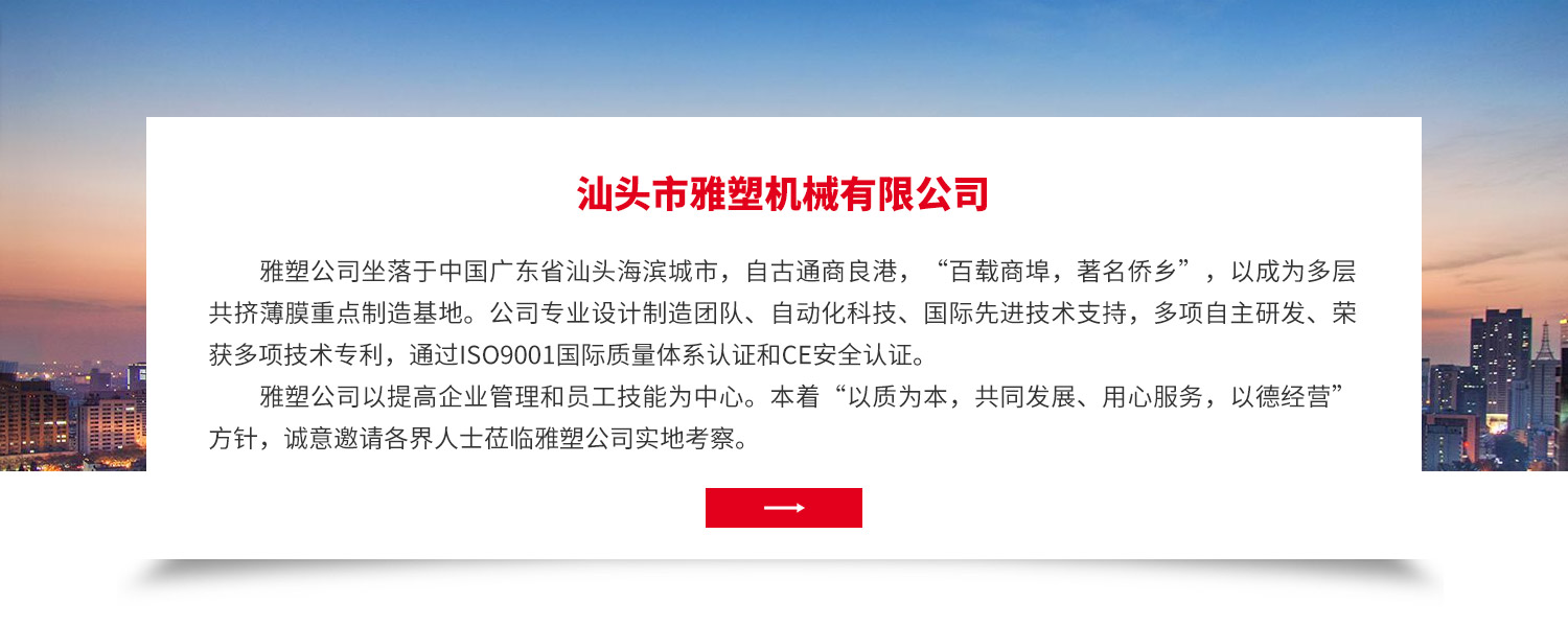雅塑公司坐落于中國廣東省汕頭海濱城市,自古通商良港,“百載商埠,著名僑鄉(xiāng)”,以成為多層共擠薄膜重點(diǎn)制造基地。